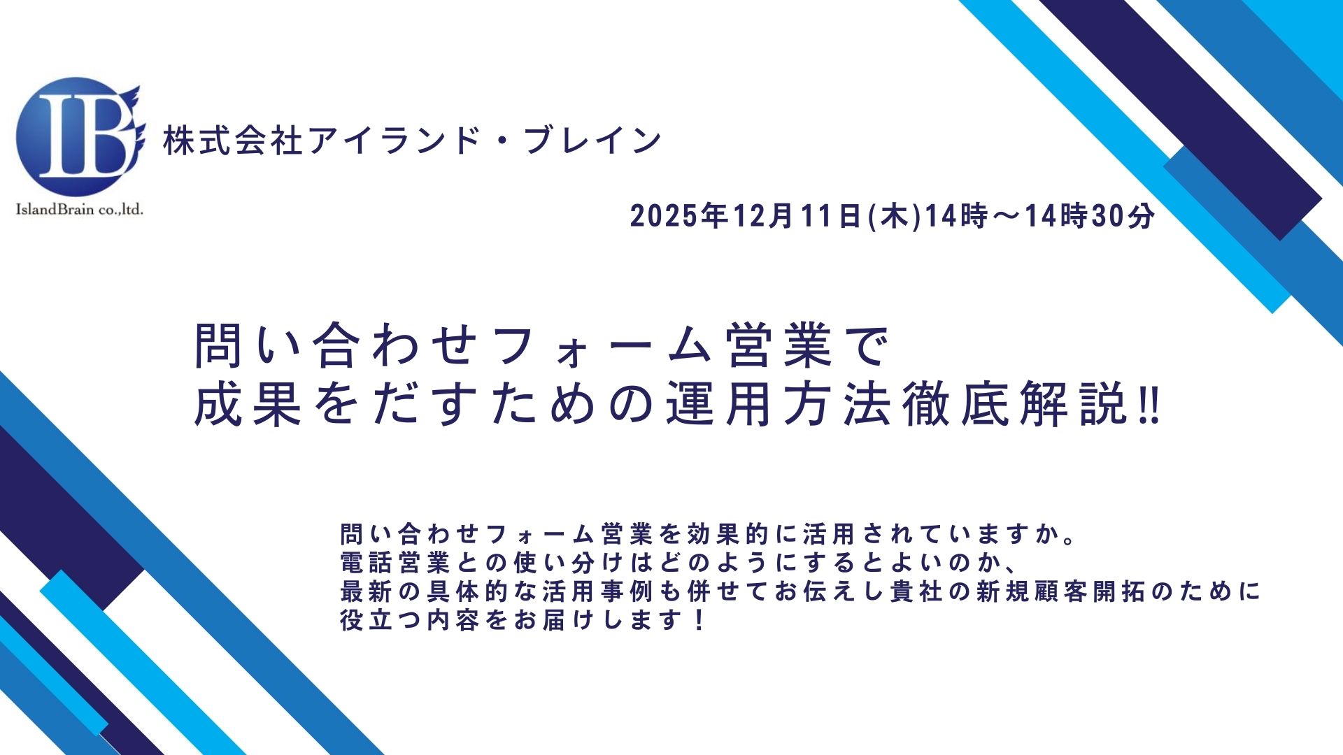 参加募集中 2025.12.11(木) 14時〜14時30分 問い合わせフォーム営業で成果をだすための運用方法徹底解説‼ 問い合わせフォーム営業を効果的に活用されていますか。電話営業との使い分けはどのようにするとよいのか、最新の具体的な活用事例も併せてお伝えし貴社の新規顧客開拓のために役立つ… このウェビナーに参加する