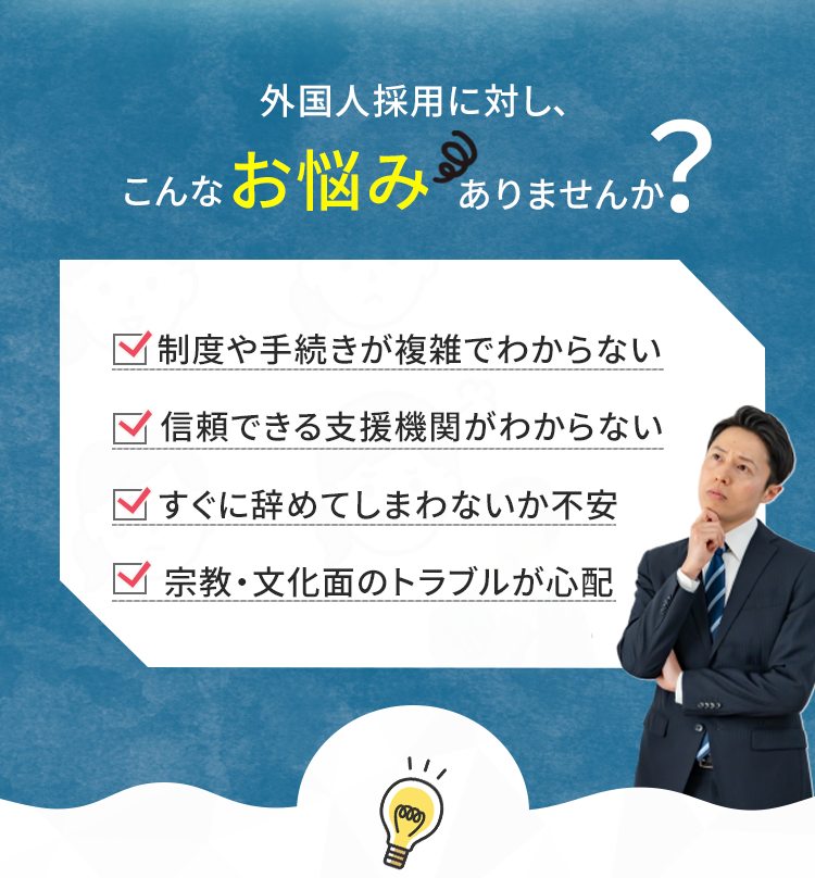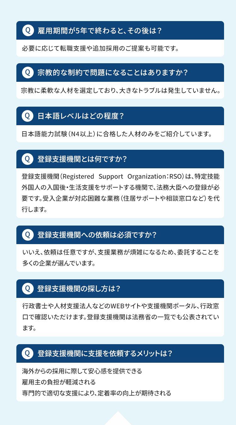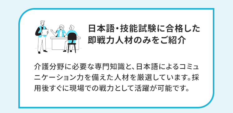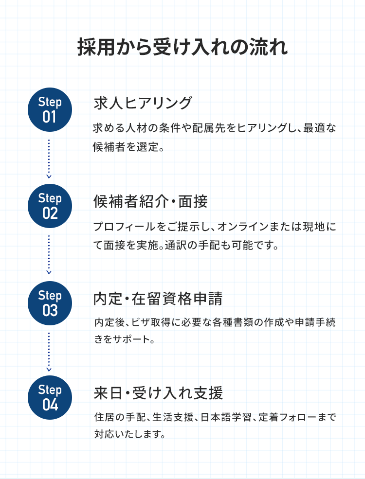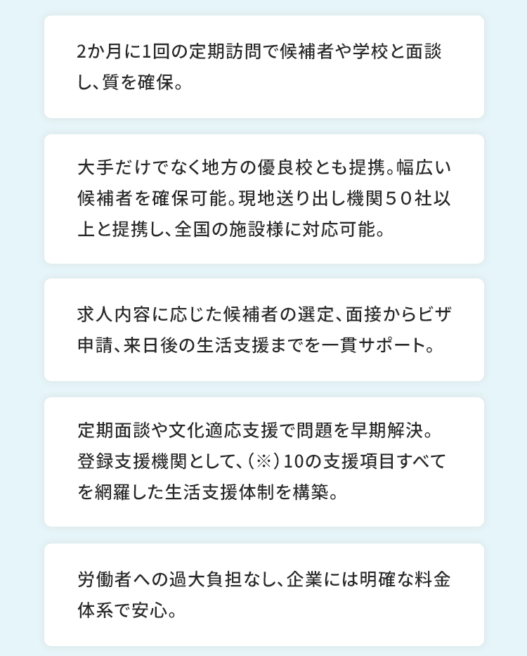 現場に寄り添い、長く活躍できる外国人採用をサポートします。