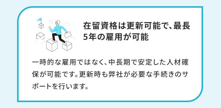 従来の技能実習制度やアルバイト雇用とは異なり、長期的な人材確保が実現できます。