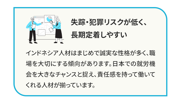 「カインドネシア」は、インドネシアに現地拠点を持ち、日本人スタッフも常駐。データに裏付けられた強みに加え、独自の体制で安心の採用と定着を支援します。
